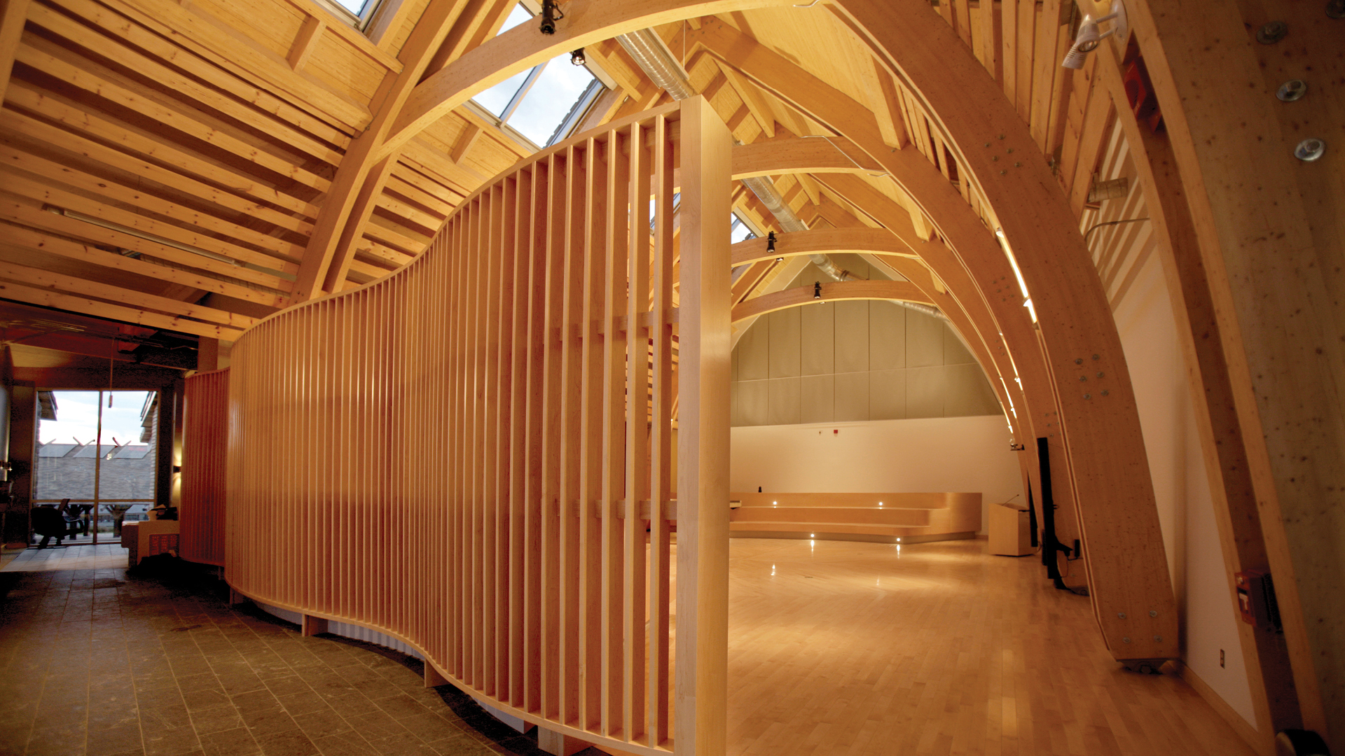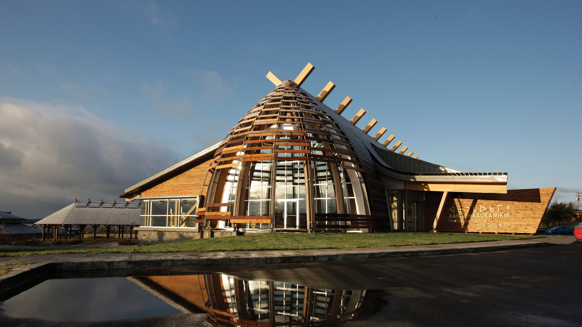 Inspiration for Aanischaaukamikw’s bold design, with its massive laminated spruce beams, comes from the essential structure of the traditional Cree “sabtuan.” The original design was developed by eminent native architect Douglas Cardinal through a series of visioning sessions and close collaboration with Elders. Cardinal and Rubin & Rotman Architects of Montreal brought the project to completion. The finished building conforms to international museum standards, making it compatible with other major institutions across the globe. (Cultural Cree Institute)