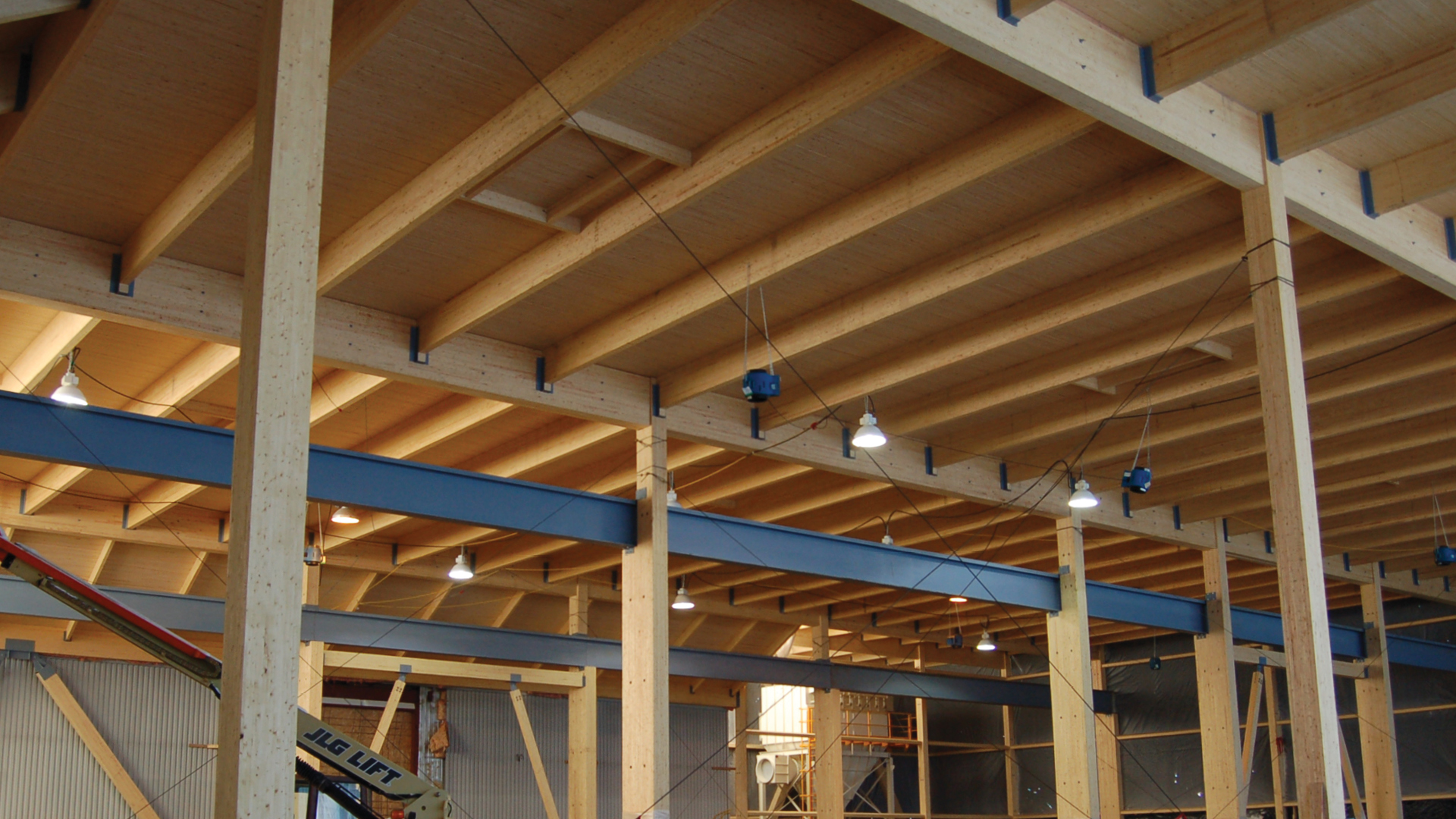 The mill at Cascades Tissue Group comprises glulam beams and laminated decking, with shear bracing elements to resist lateral forces also provided by glulam beams. The simplicity of design provides an economically viable, yet visually unique workplace, a showpiece for modern industrial manufacturing facilities.