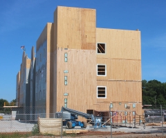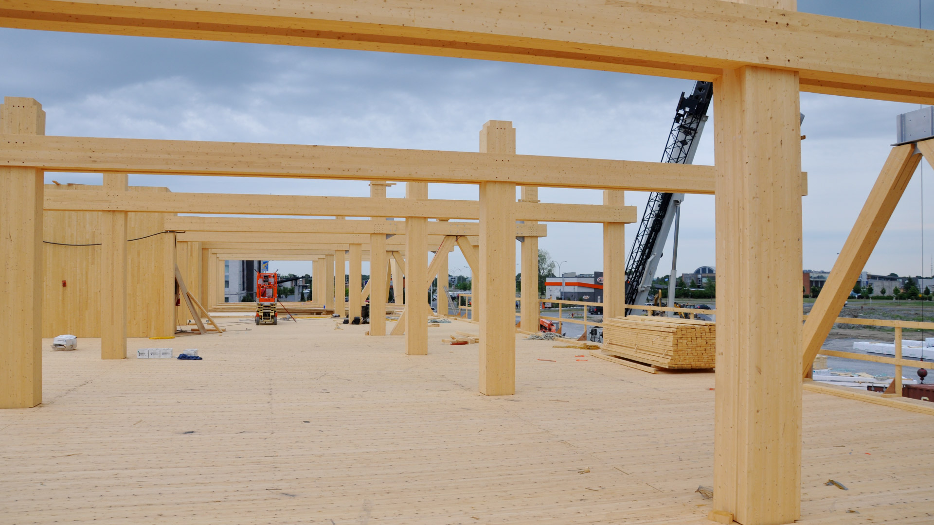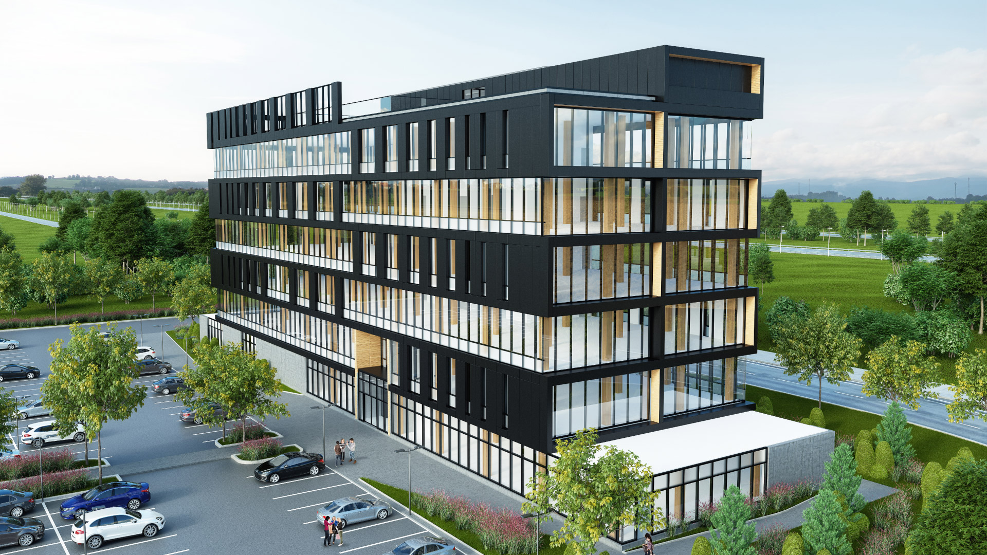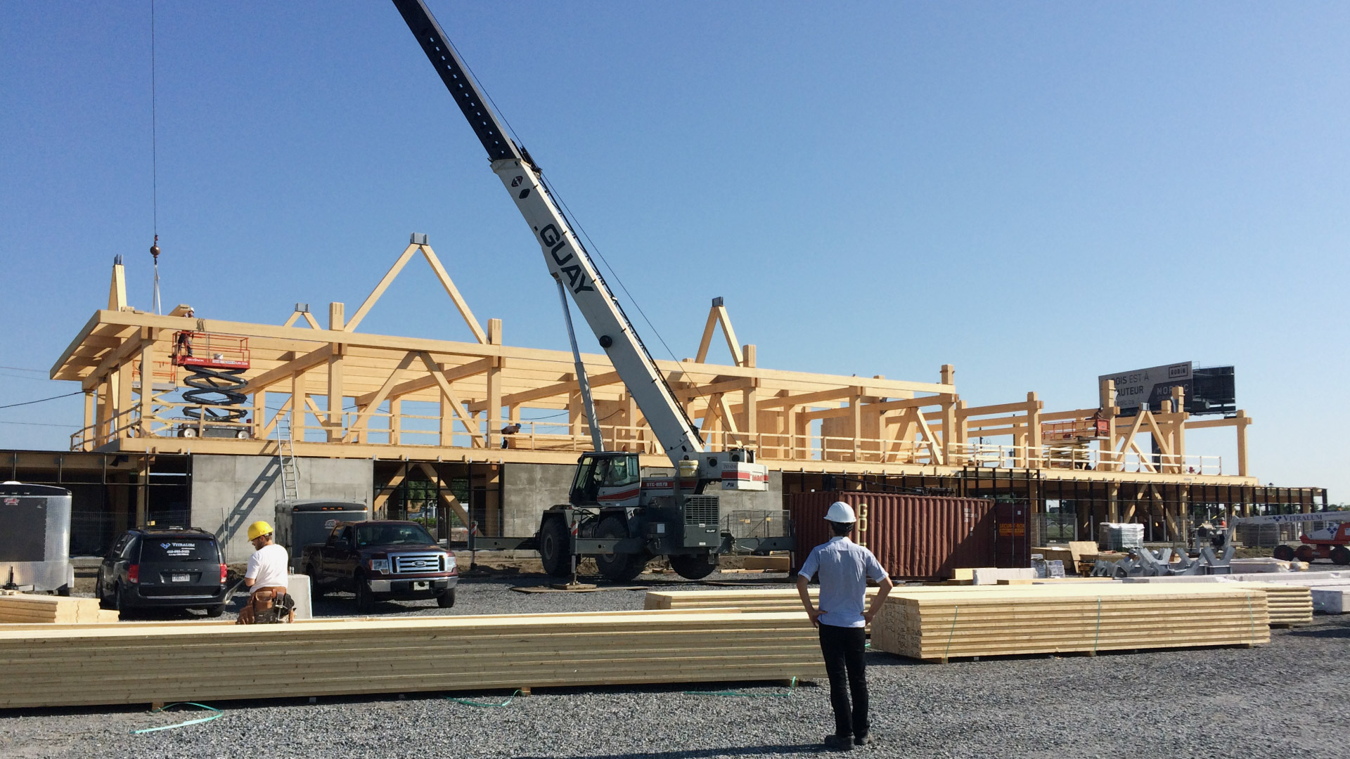 Synergia is a commercial rental complex off Highway 20 in Saint-Hyacinthe. Its structure features a post-and-beam system as well as glulam decking visible under the floor system. Cross-laminated timber members are used in the elevator shafts and stairways. The complex is a Groupe Robin project.