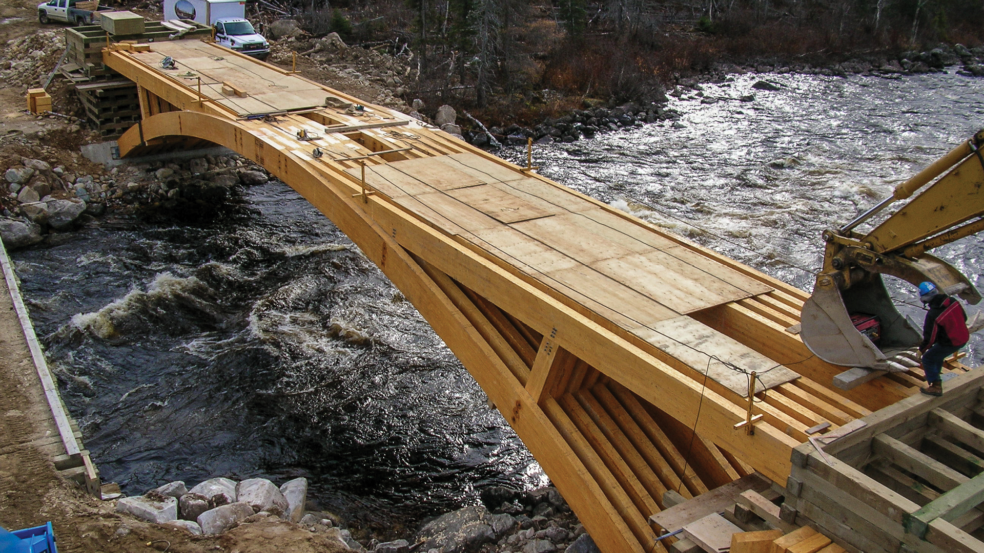 North of Lakes Albanel and Mistassini, the Temiscamie River timber bridge features a straight section supported on arched beams spanning 30 m. The roadbed, at 34 m overall length, is comprised of treated hemlock timbers sitting on a concrete foundation that takes over the lateral thrust of the arches.