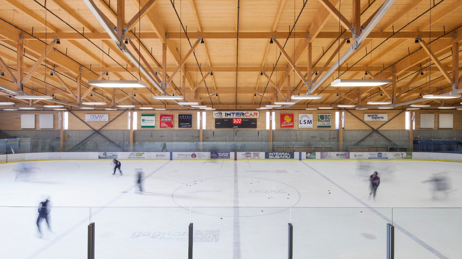 This space-age structure features a hybrid wood-steel truss system supporting a glulaminated deck. In addition to providing excellent structural properties, the timber reduces the overall environmental footprint of the building, with a net reduction of 104 tonnes of carbon compared to a steel structrure (cecobois).