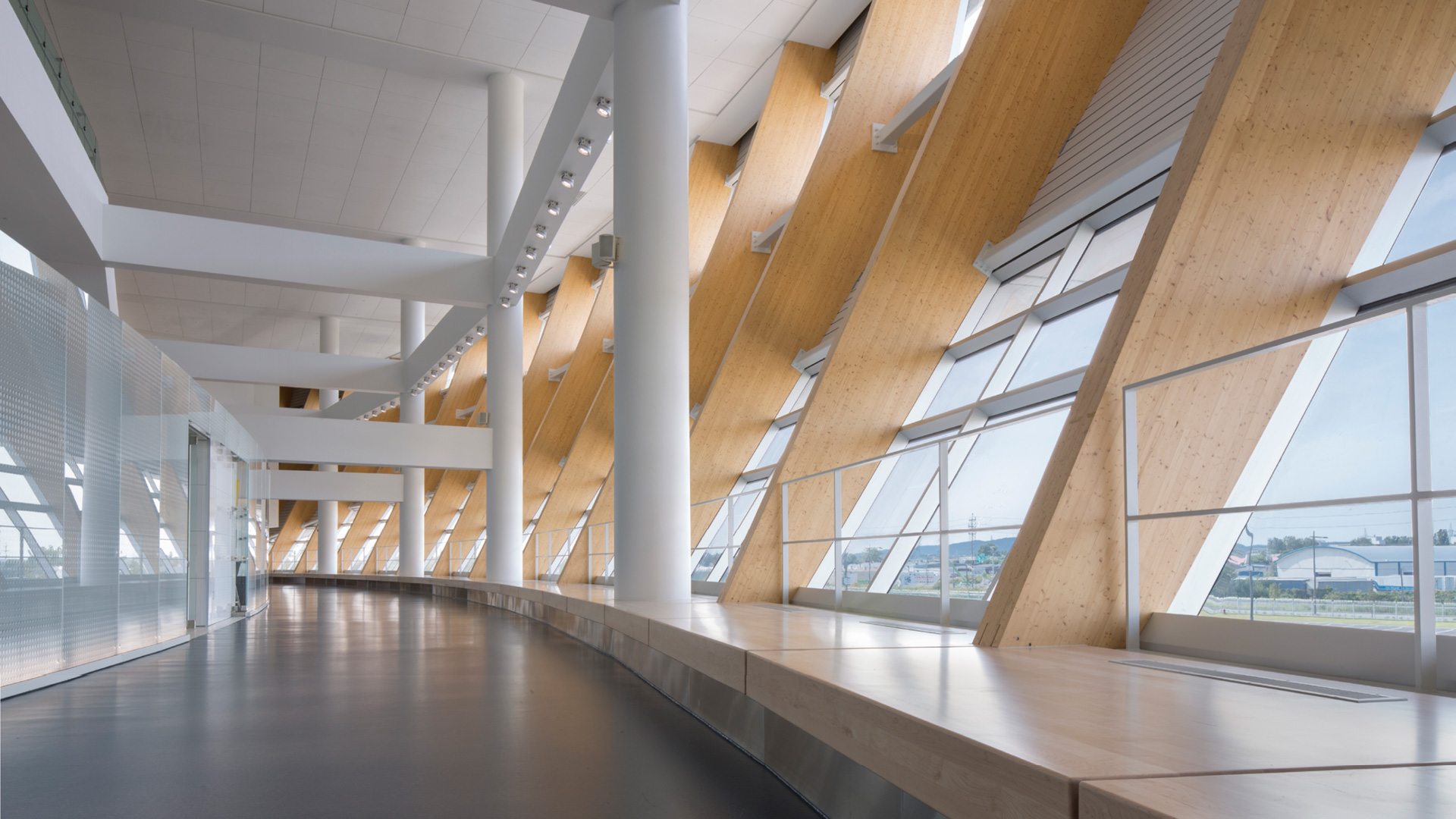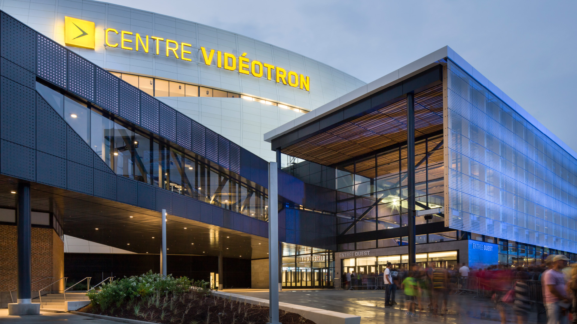 The Videotron Centre includes 92 needles made of Nordic Lam glued-laminated timber. These columns are designed to support the weight of the curtain walls while transferring lateral loads to the main structure. These elements are open to spectators in the peripheral corridors of the amphitheatre. Each column is composed of 2 members, for a total of 184 elements and 473 cubic meters of wood, resulting in the sequestration of 362 tons of CO2.