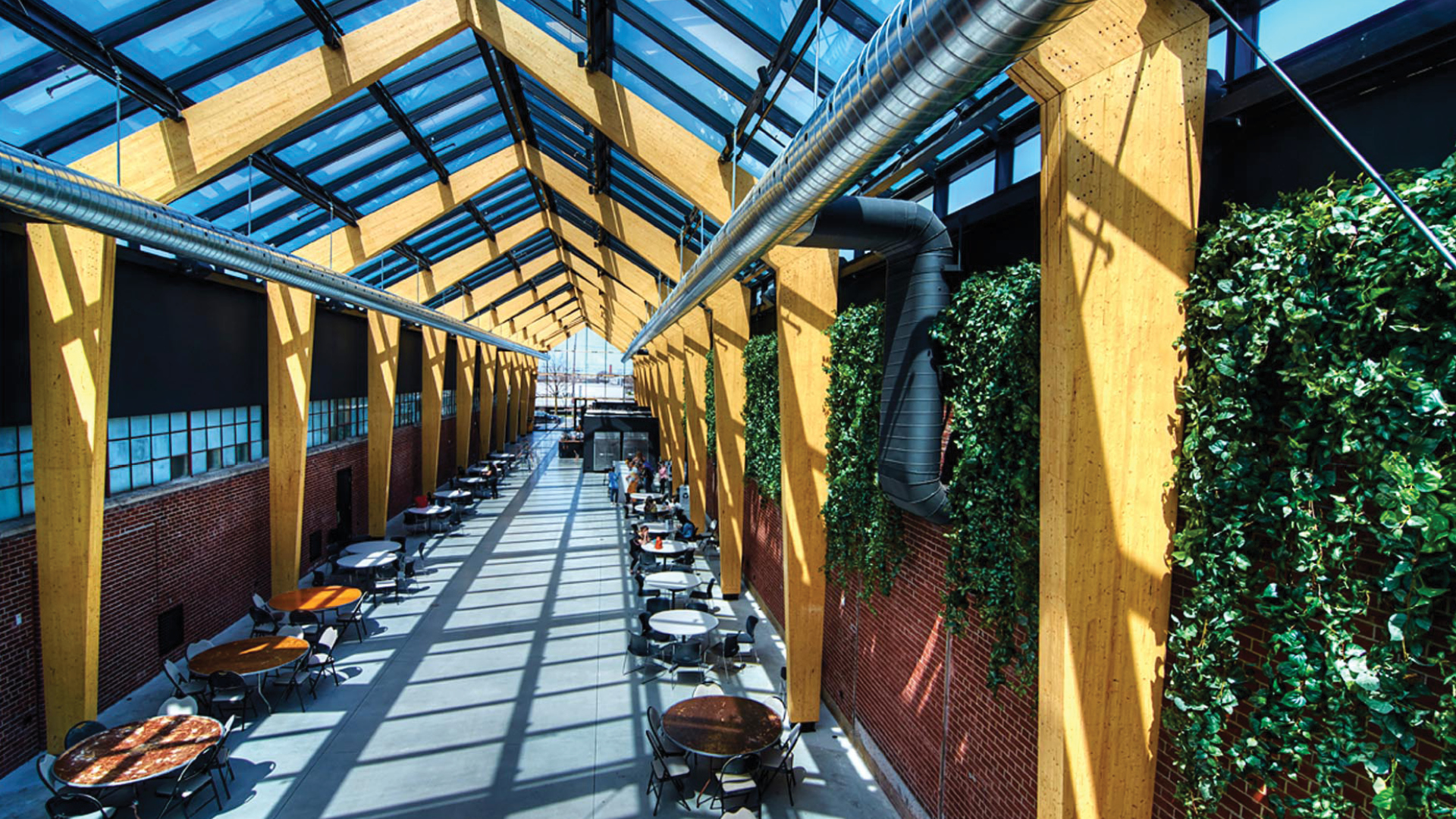 Situé au cœur du siège social du Groupe Dynamite à Ville Mont-Royal, l’atrium comprend cafétéria, comptoirs de restauration, lounge et salle de formation. C’est un véritable lieu de rencontre. Le bois contribue à créer une ambiance chaleureuse dans cet espace ouvert et lumineux où l’esthétisme minimaliste souligne la beauté naturelle du matériau. (cecobois)