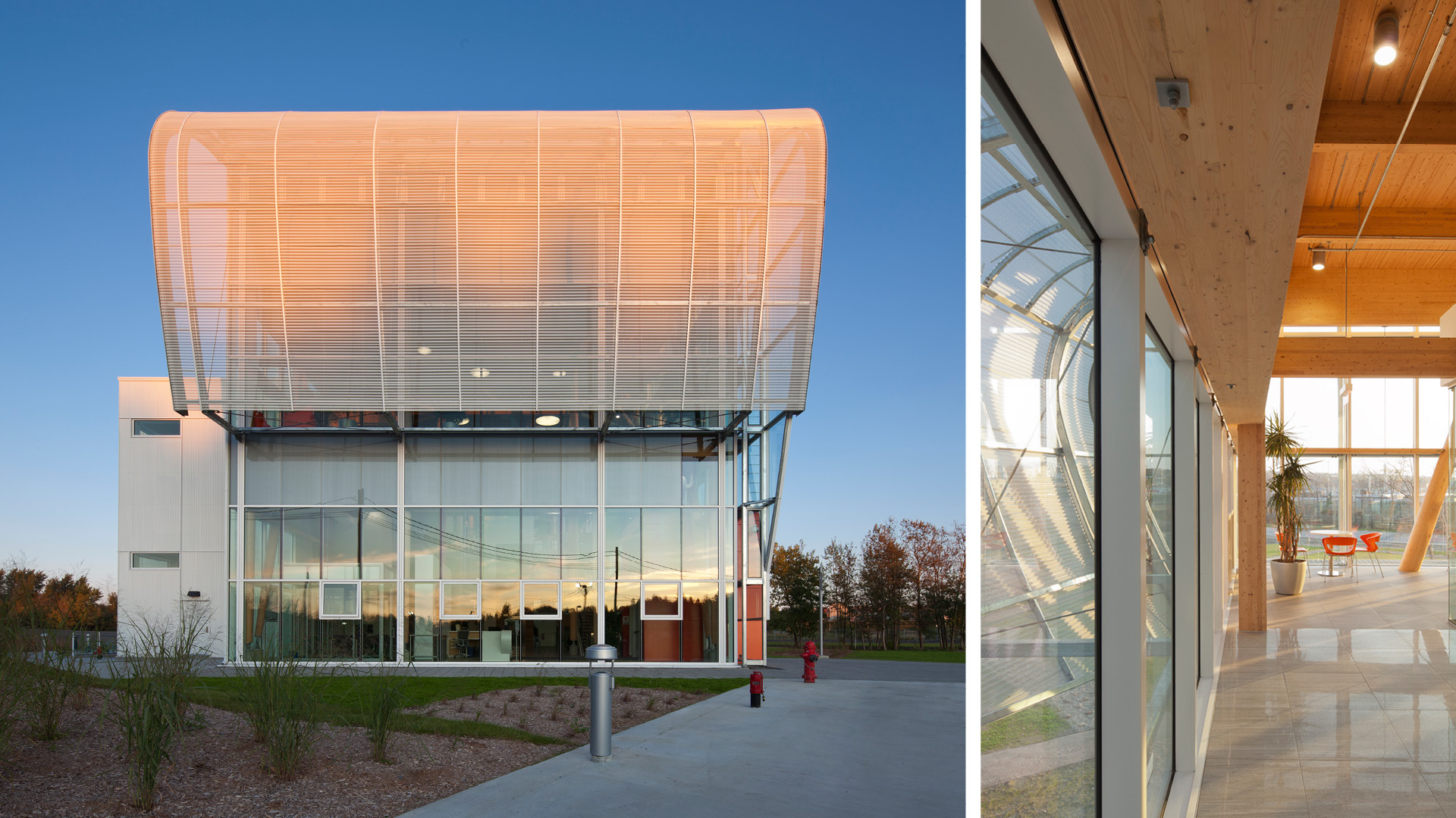 Ce bâtiment à la silhouette audacieuse attire immanquablement le regard. En plus d’intégrer une structure de bois triangulée et des colonnes rondes à inertie variable exposées sur sa longue façade, ce bâtiment se démarque par sa haute valeur écologique, en atteignant la certification LEED-NC Or. Voisin de l’usine de vaccins qui est située dans le parc technologique du Québec métropolitain, cet édifice loge les bureaux corporatifs de la société.