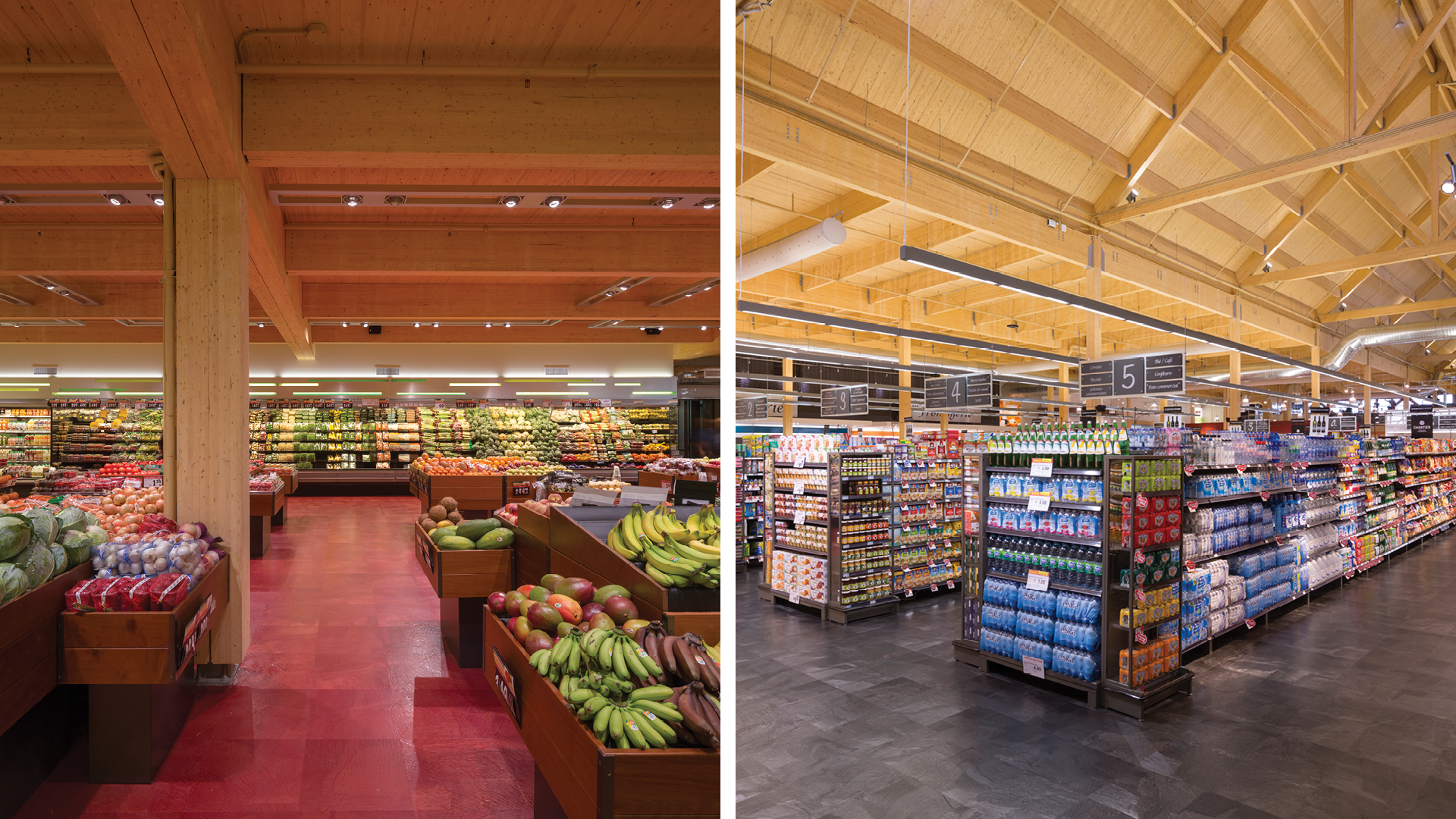 L’IGA des Sources de Boischatel est le premier supermarché de l’est du Canada à être construit entièrement en bois massif. L’épicerie accueille une mezzanine avec vue sur le fleuve Saint-Laurent et l’île d’Orléans. À l’exception des fondations, la structure est constituée d’une charpente en bois lamellé-collé, y compris la cage d’ascenseur. Le plafond cathédrale qui s’étend sur toute la longueur du bâtiment ajoute une touche traditionnelle à l’édifice.