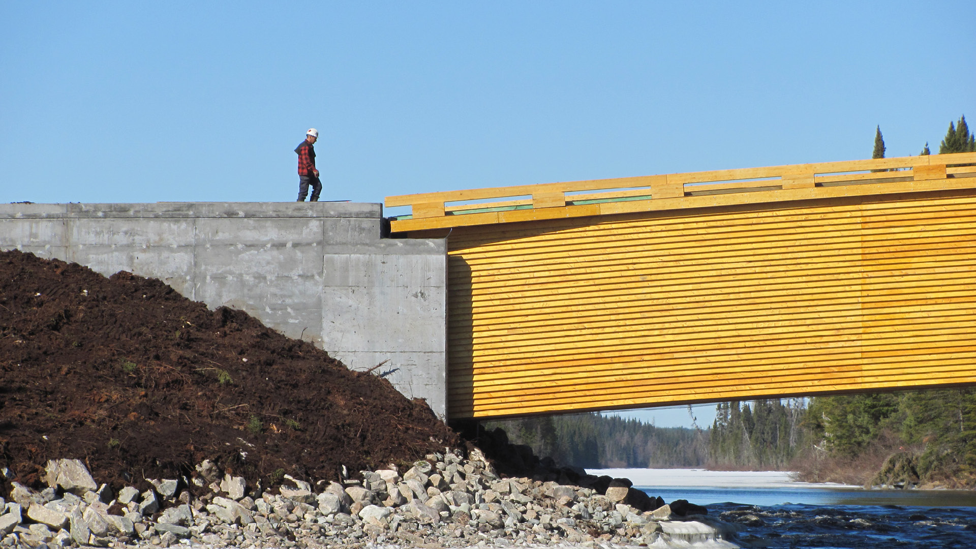 La conception de ce pont nécessitait de sortir des sentiers battus, car il traverse une rivière très large. Elle a intégré un concept innovateur de deux poutres-caissons avec des ailes en bois lamellé-collé, vissées à des âmes en bois lamellé-croisé. Ce système permet de supporter des charges très lourdes, tout en offrant une très longue portée.