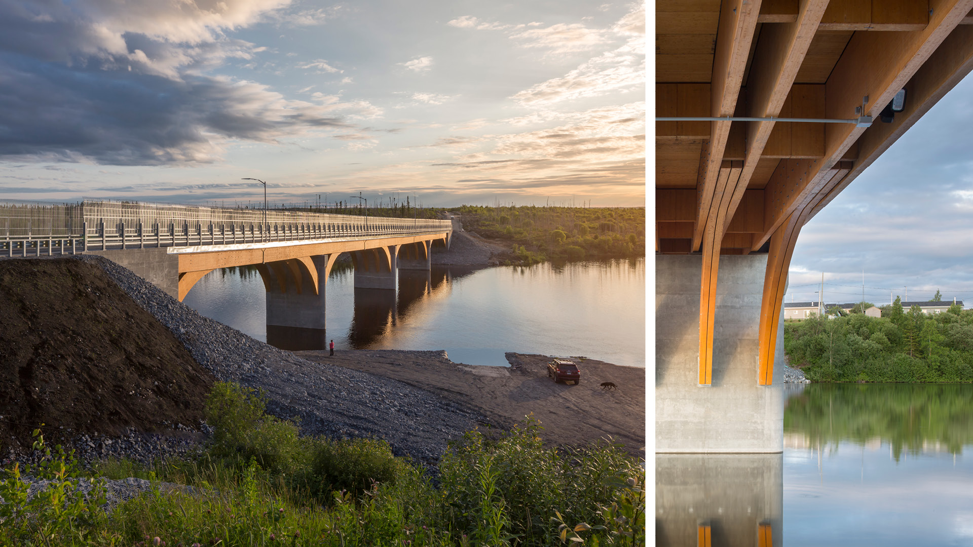 Situé au-dessus de la passe Uupaachikus, ce pont de 160 m de longueur est composé de poutres en bois lamellé-collé de quatre sections droites et d’arches semi-continues. Les poutres droites de 24 m sont assemblées par des connecteurs aux poutres en arches de 15 m. Celles-ci sont reliées aux piles et aux culées à l’aide de tourillons. La structure de bois est protégée par un tablier étanche. La conception est réalisée par Stantec – Ponts et ouvrages d'art.