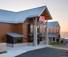 The atrium, located in the heart of Groupe Dynamite, in Town of Mount Royal, features a cafeteria, lounges, snack bars, and training rooms. The use of wood and minimalist design underline the natural beauty of wood, making this a popular meeting spot. (cecobois)