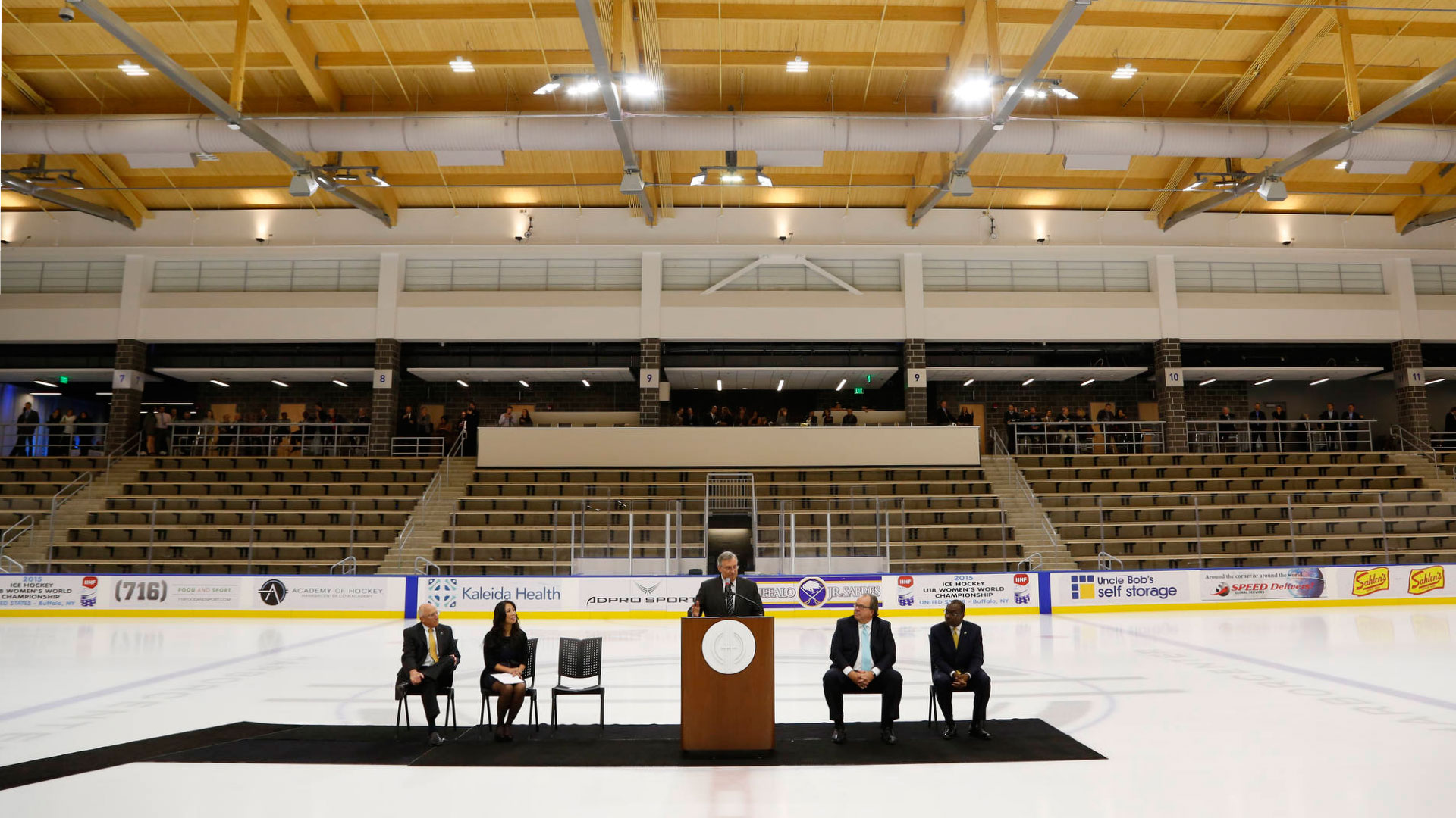 The Canisius Golden Griffins (Griffs) and the National Hockey League Buffalo Sabres moved into the brand new HarborCenter training facility in downtown Buffalo. The building has NHL rink dimensions (200 ft by 85 ft), with 1,800 seats, and a sports performance training facility. It’s finally a rink that the Golden Griffins can use as a recruiting tool. (The Buffalo News)