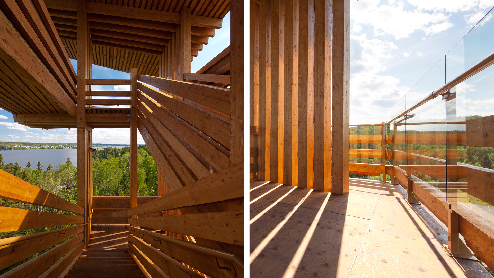 Supported by 4 main columns comprising 7 glulam elements, the observation tower provides splendid views of the natural surroundings. The 23,7 m tower at the Ermitage Saint-Antoine is accessed via a nature trail at this historic pilgrimage site.