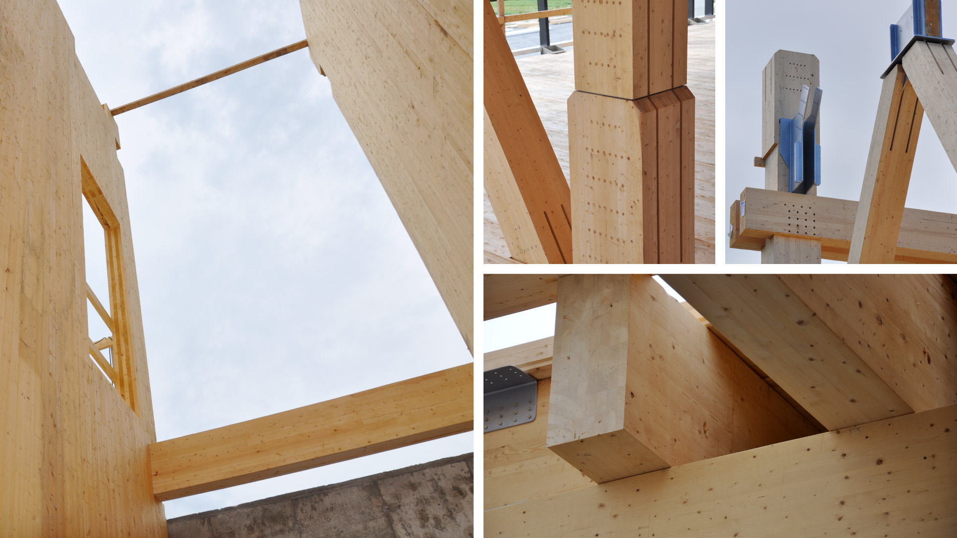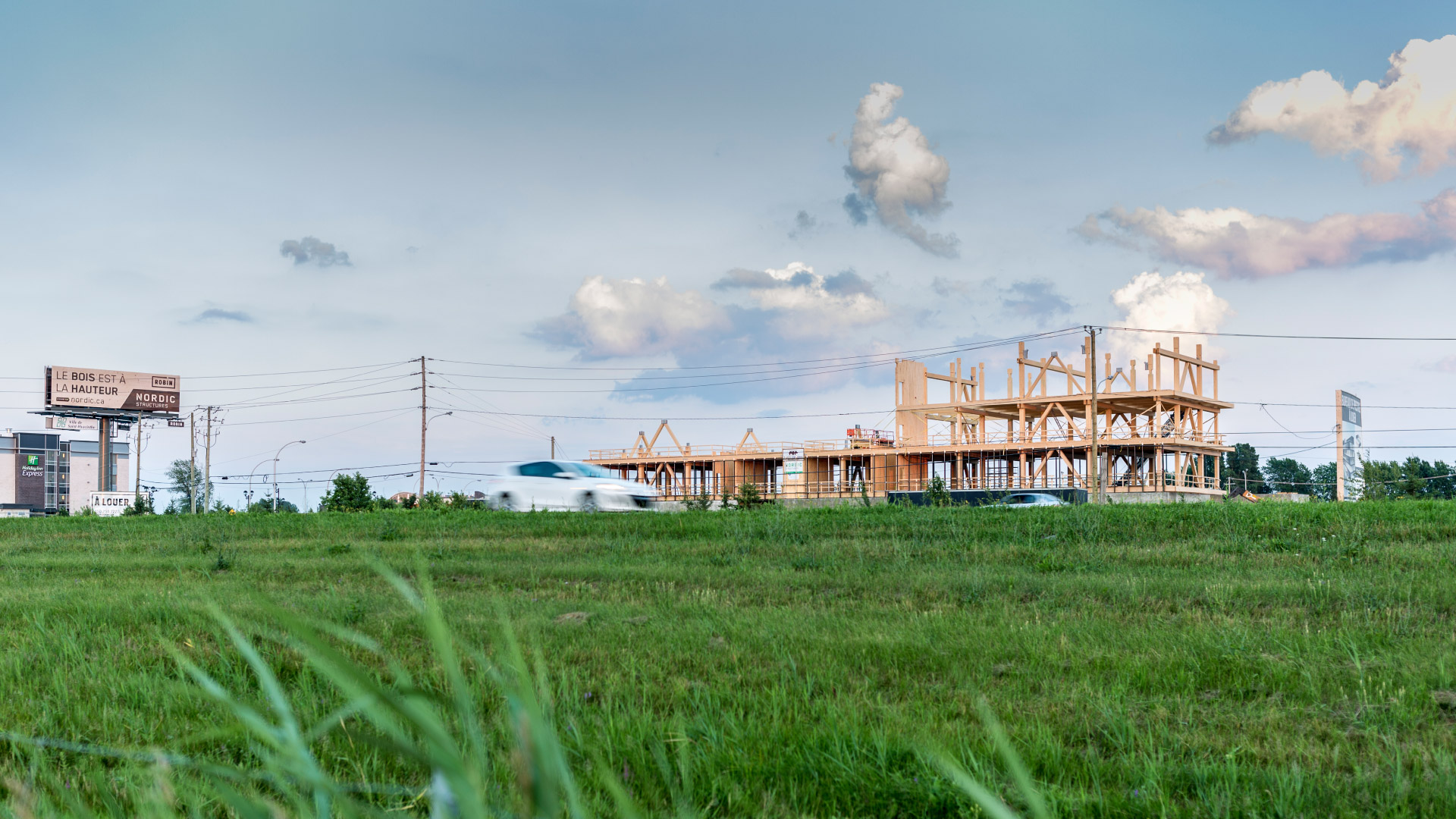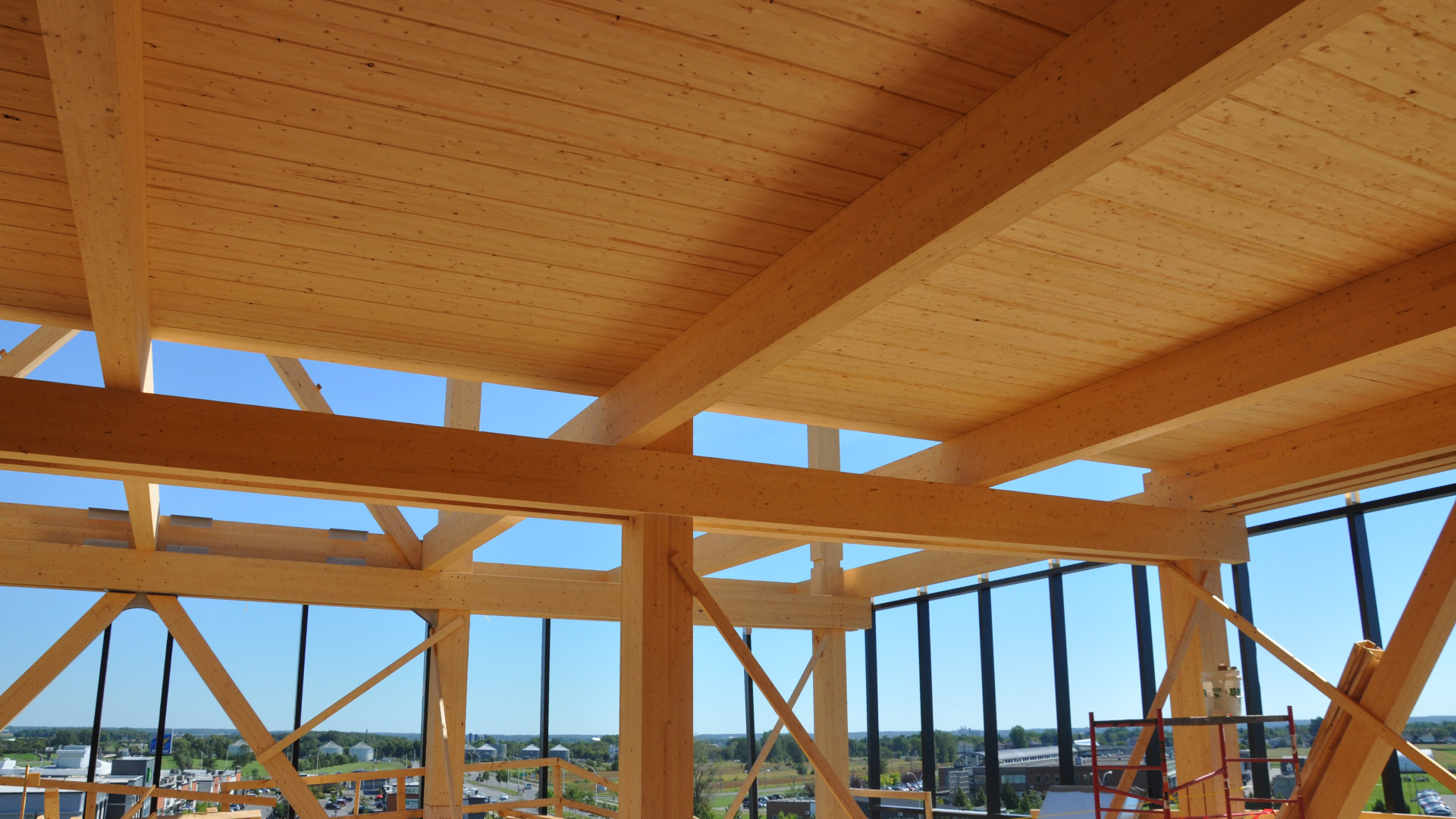 Synergia is a commercial rental complex off Highway 20 in Saint-Hyacinthe. Its structure features a post-and-beam system as well as glulam decking visible under the floor system. Cross-laminated timber members are used in the elevator shafts and stairways. The complex is a Groupe Robin project.
