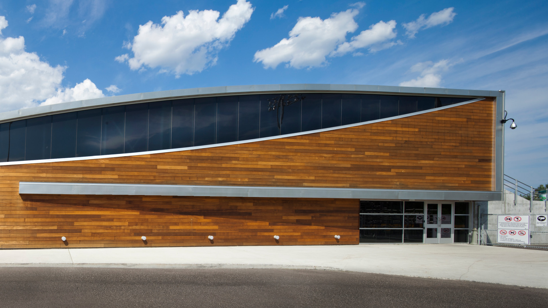 This space-age structure features a hybrid wood-steel truss system supporting a glulaminated deck. In addition to providing excellent structural properties, the timber reduces the overall environmental footprint of the building, with a net reduction of 104 tonnes of carbon compared to a steel structrure (cecobois).