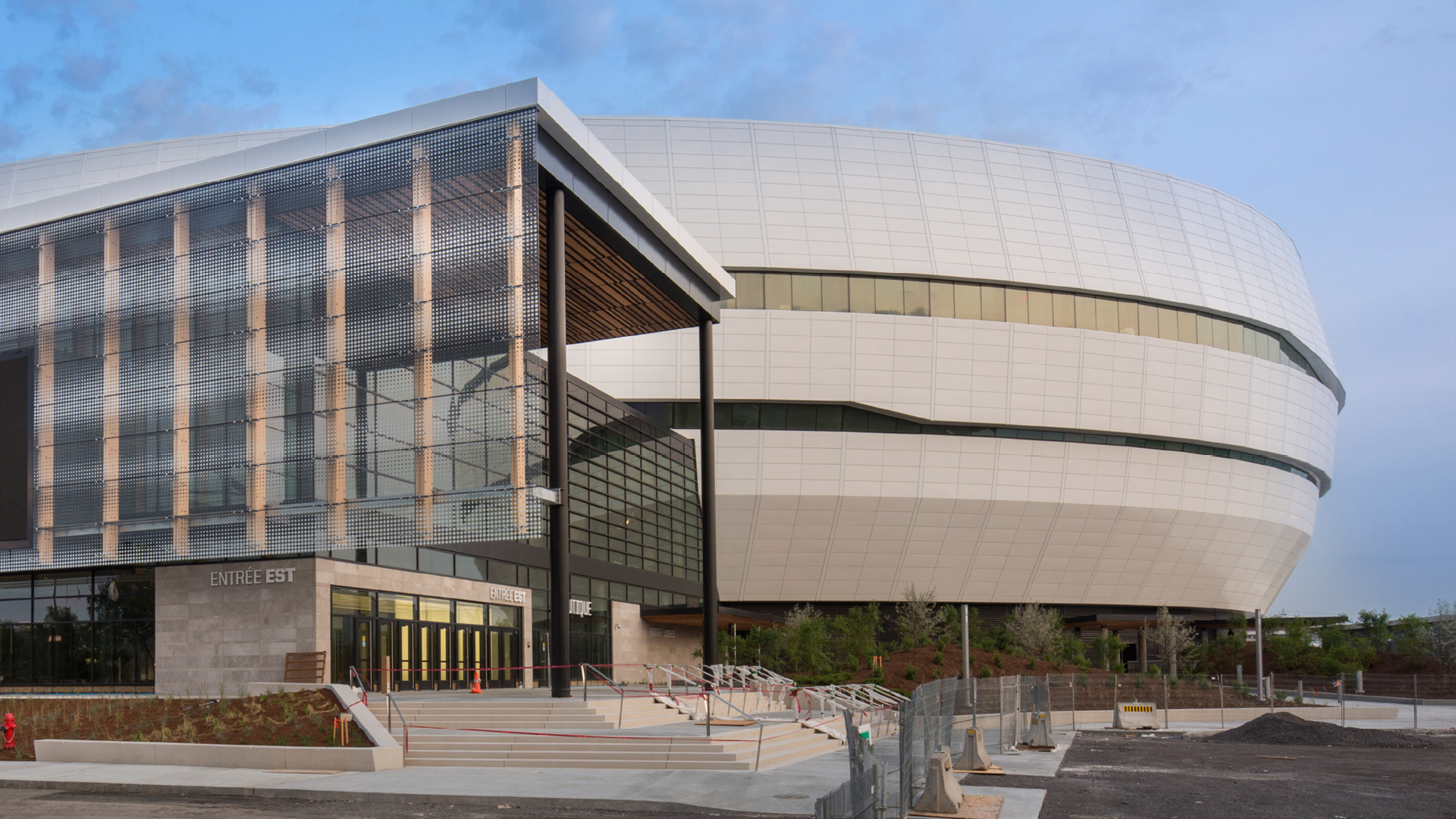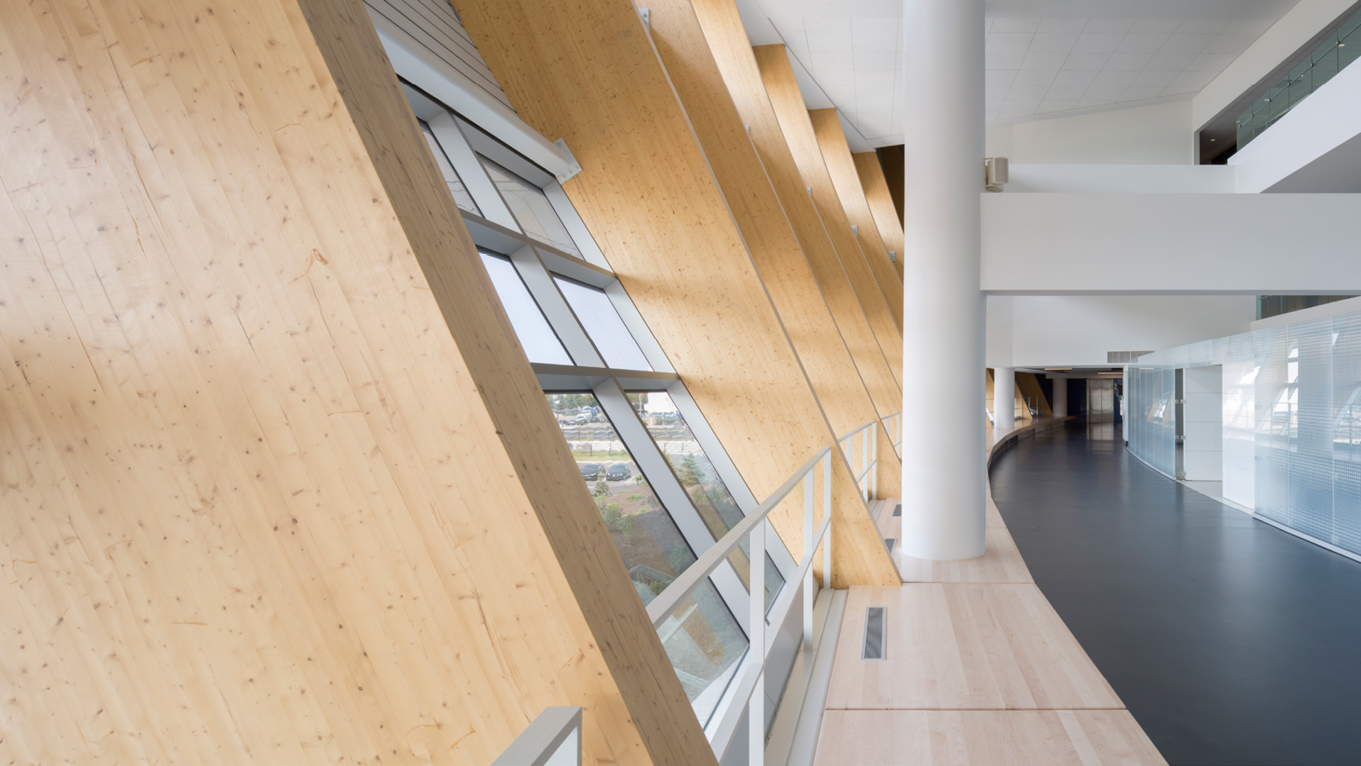 The Videotron Centre includes 92 needles made of Nordic Lam glued-laminated timber. These columns are designed to support the weight of the curtain walls while transferring lateral loads to the main structure. These elements are open to spectators in the peripheral corridors of the amphitheatre. Each column is composed of 2 members, for a total of 184 elements and 473 cubic meters of wood, resulting in the sequestration of 362 tons of CO2.