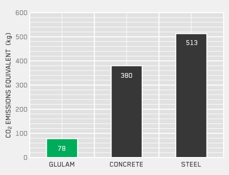 Wood production emits much less carbon dioxide (CO2)—a potent greenhouse gas—than does concrete or steel (see the chart below). In addition, growing trees trap atmospheric CO2 and lock it away within their fiber. Building with wood generates 26% to 31% less greenhouse gas than building with concrete or steel respectively (CORRIM). And, once the CO2 sequestered in its fiber is counted, wood is actually carbon negative. 1,000 m3 of wood traps the equivalent of 765 tons of carbon.