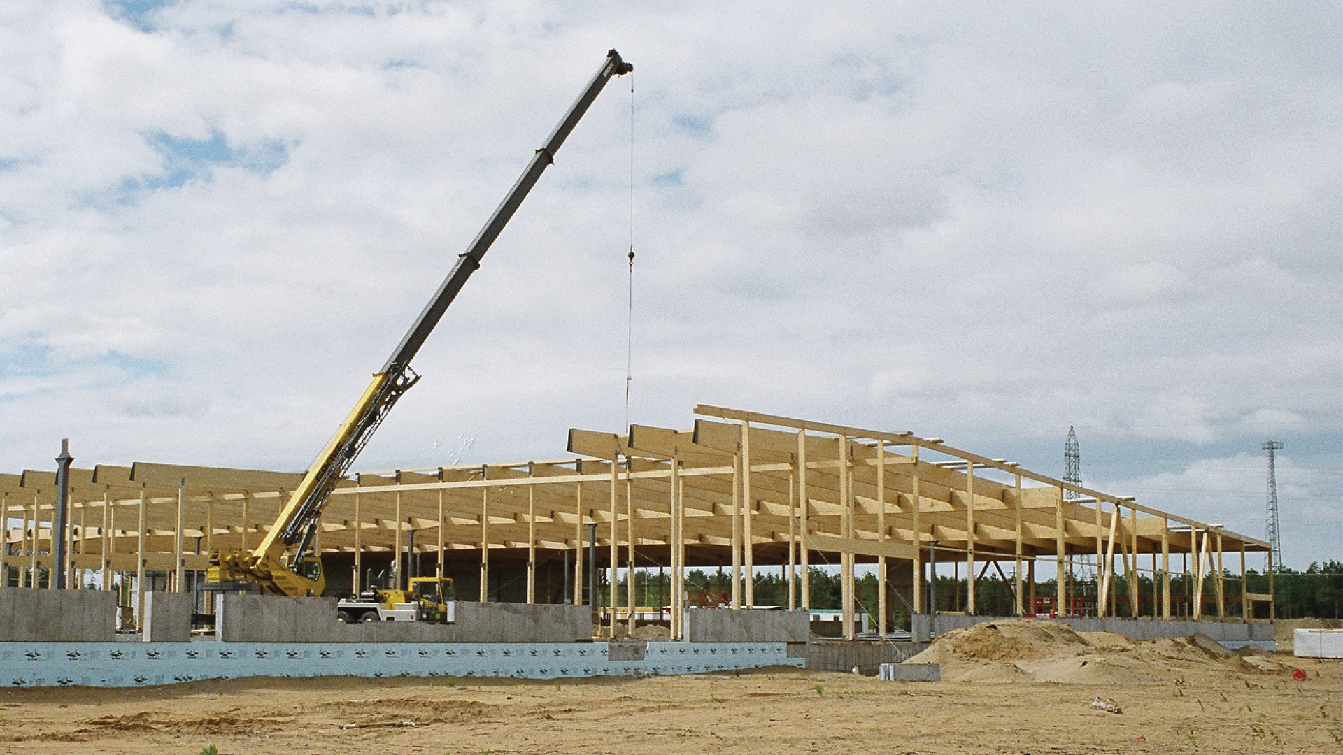 L’usine de produits de bois d’ingénierie de Barrette Structural (Anciennement Groupe Distribution Toiture Mauricienne) est constituée d’un système poteaux-poutres en bois lamellé-collé pour la résistance aux charges gravitaires et de contreventements en bois lamellé-collé pour la résistance aux charges latérales. La simplicité de la structure rend cette solution compétitive pour les bâtiments industriels, en plus d’ajouter une ambiance éclairée à l’espace de travail.