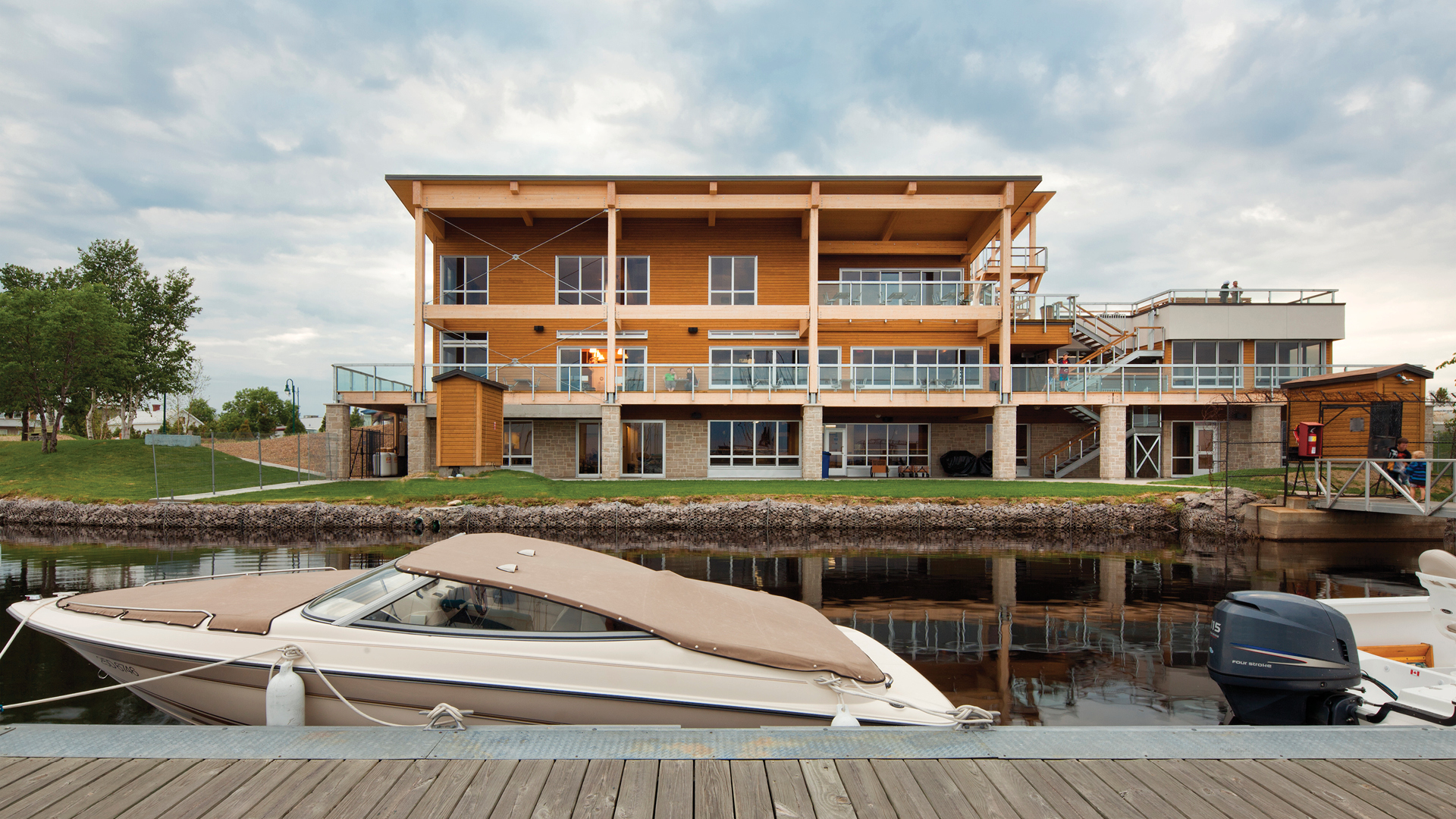 Projet à vocation récréative et d’usage multifonctionnel, la Capitainerie de la marina de Roberval s’inscrit dans une politique d’aménagement et de revitalisation du rivage lacustre où le port de plaisance occupe le point central. Le concept structural est un système de poteaux-poutres en bois lamellé-collé avec un toit en pente. La plus grande face du bâtiment est orientée vers le rivage.