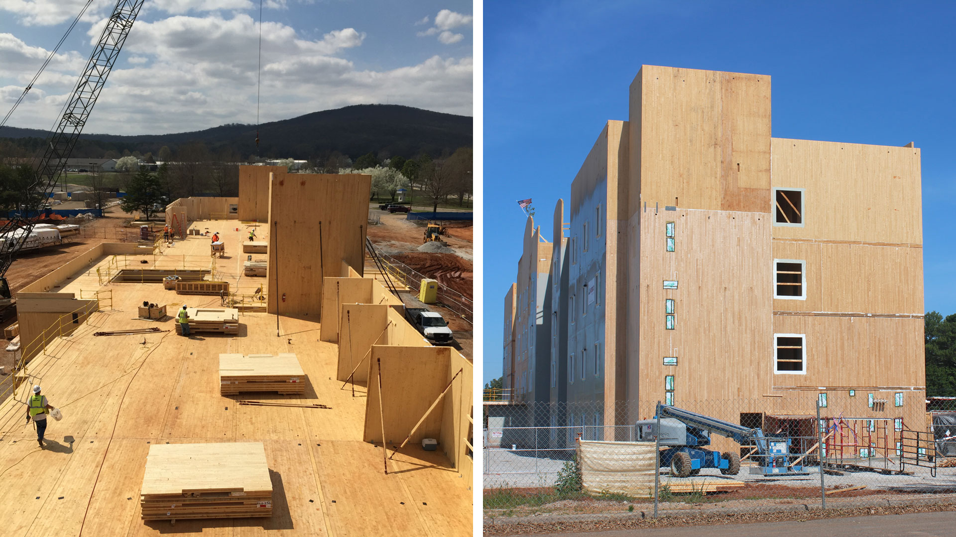 Le premier hôtel en Amérique du Nord construit à partir de bois lamellé-croisé (CLT), un bâtiment de 4 étages totalisant 92 chambres, sert les besoins d'hébergement des militaires du Redstone Arsenal. Les murs, les planchers/plafonds, et les cages d'escaliers et d'ascenseur sont composés de 1606 m3 de CLT et de 34 m3 de bois lamellé-collé.
