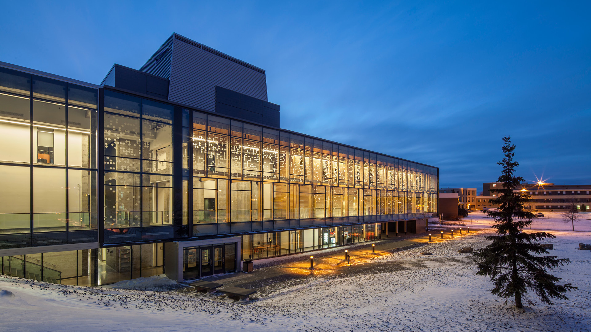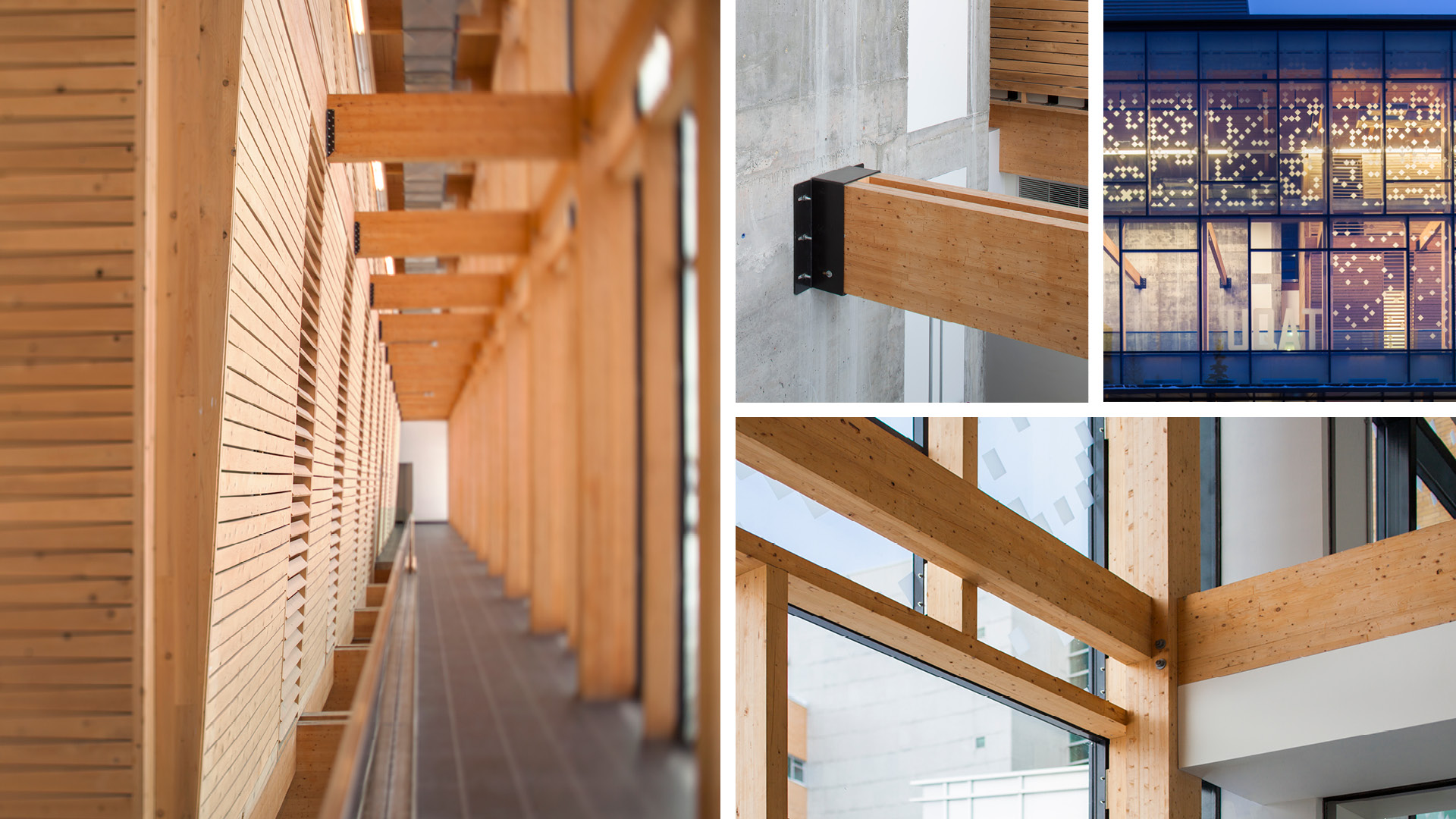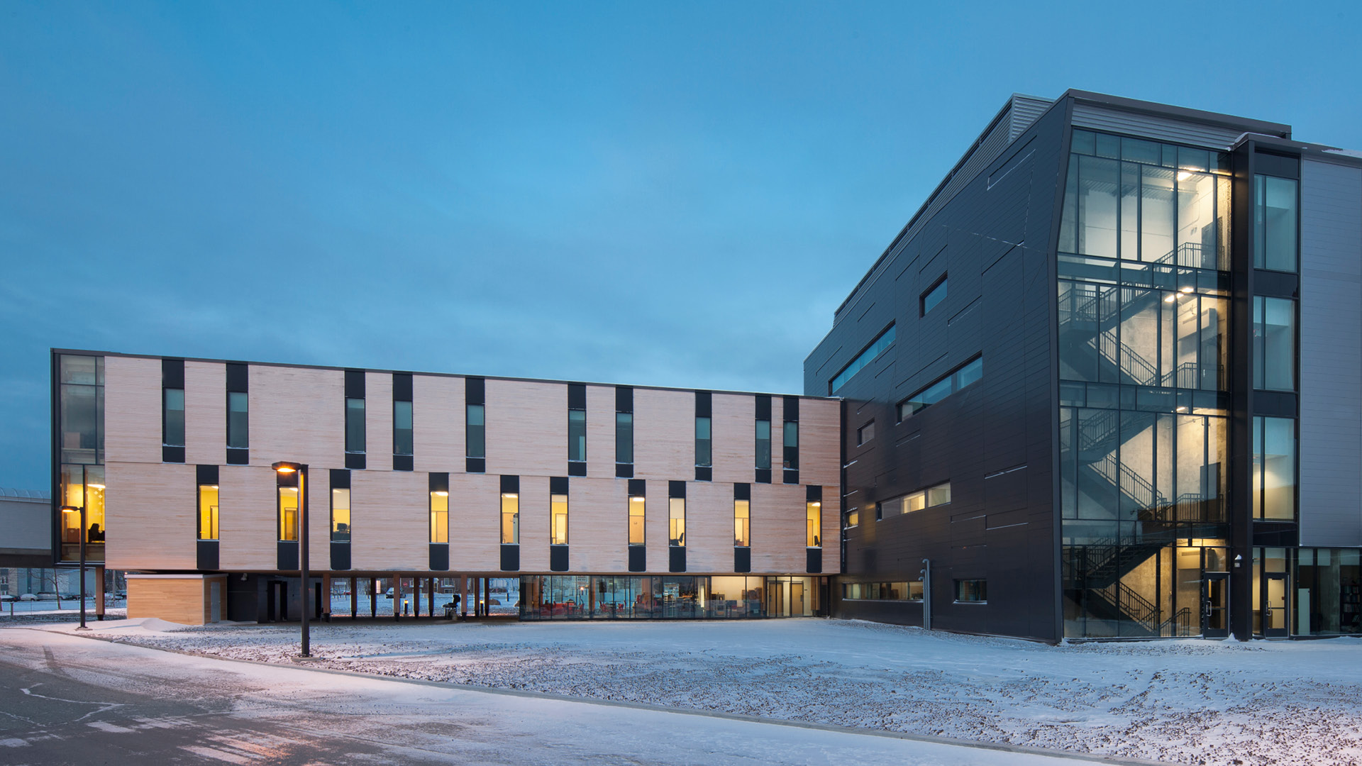 Le pavillon des sciences de l’UQAT est un bâtiment d’une superficie de 1355 m² et d’une hauteur de 12,8 m. Le volume de bois de structure totalise 330 m³. Le bâtiment de trois étages est de construction hybride bois-béton-acier. Le projet s’inspire de l’histoire même de l’Abitibi et des deux ressources primaires qui ont fait naître la région : les forêts et les mines. À lire, l’étude de cas sur ce bâtiment ici.