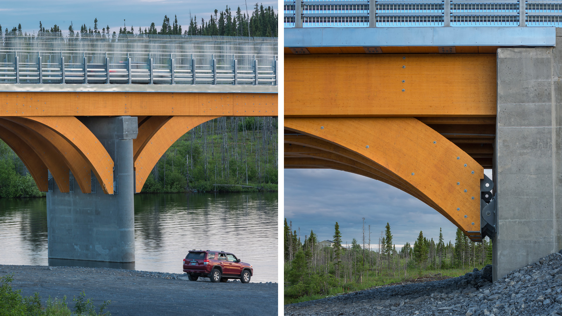 Situé au-dessus de la passe Uupaachikus, ce pont de 160 m de longueur est composé de poutres en bois lamellé-collé de quatre sections droites et d’arches semi-continues. Les poutres droites de 24 m sont assemblées par des connecteurs aux poutres en arches de 15 m. Celles-ci sont reliées aux piles et aux culées à l’aide de tourillons. La structure de bois est protégée par un tablier étanche. La conception est réalisée par Stantec – Ponts et ouvrages d'art.