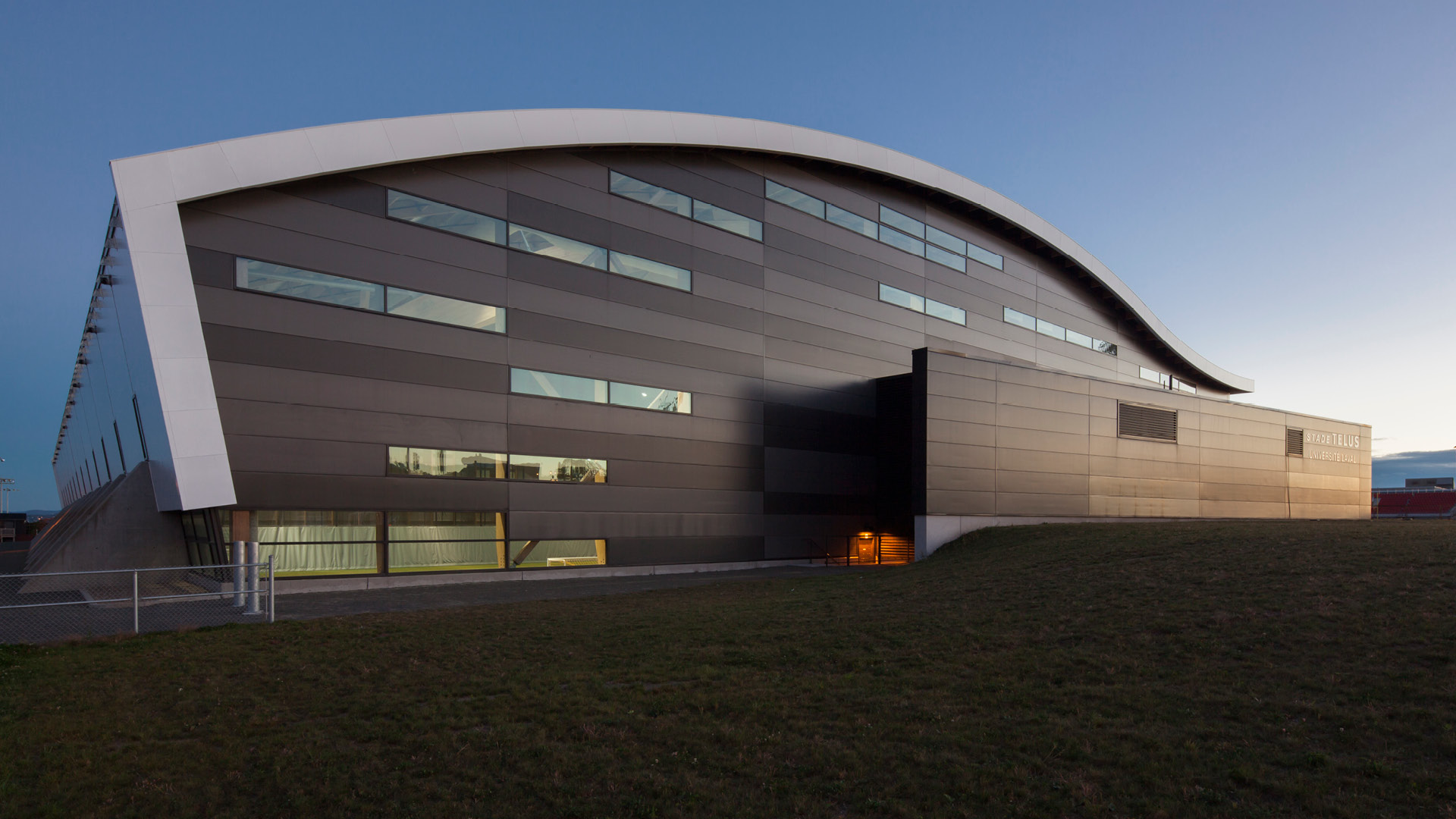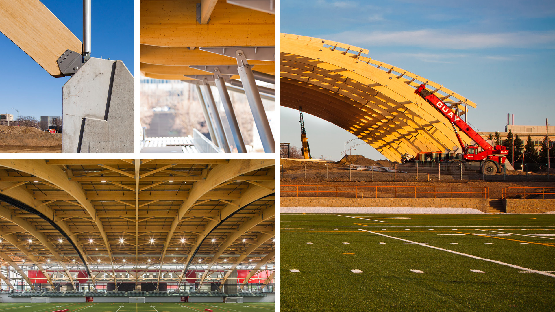 Le stade TELUS-Université Laval s’inscrit dans un projet de grande envergure offrant un terrain de 100 x 60 m pour la pratique du soccer, du football et du rugby. Il comprend 450 places dans les gradins. Treize arches à trois articulations, fabriquées de poutres en bois lamellé-collé à inertie variable dont la plus grande hauteur est de 1800 mm, donnent une portée de 67,6 m et une hauteur libre de 18 m au centre du stade.
